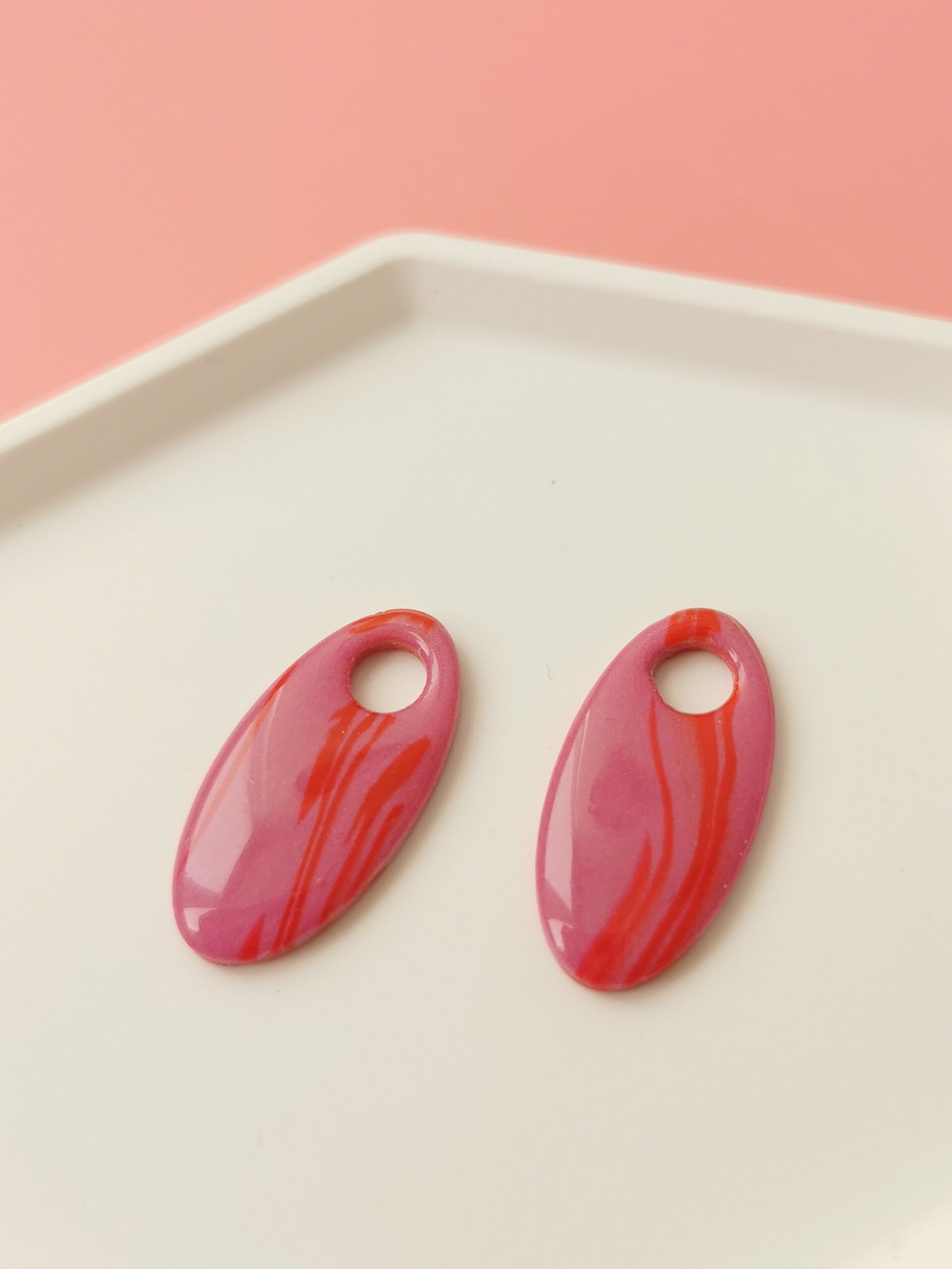 Mix & Match met deze leuke roze hangers met rode lijnen. Ze zijn gemaakt van polymeerklei en afgewerkt met resin, waardoor ze een mooie glans hebben.