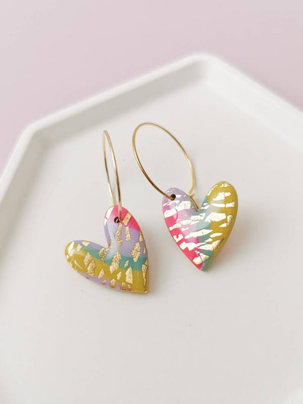 Kleurrijke hartjes oorbellen met regenboogkleuren en goud accent. Ze zijn handgemaakt van polymeerklei, licht in gewicht en lekker kleurrijk! Ze zijn tevens afgewerkt met resin wat zorgt voor een mooie glans.