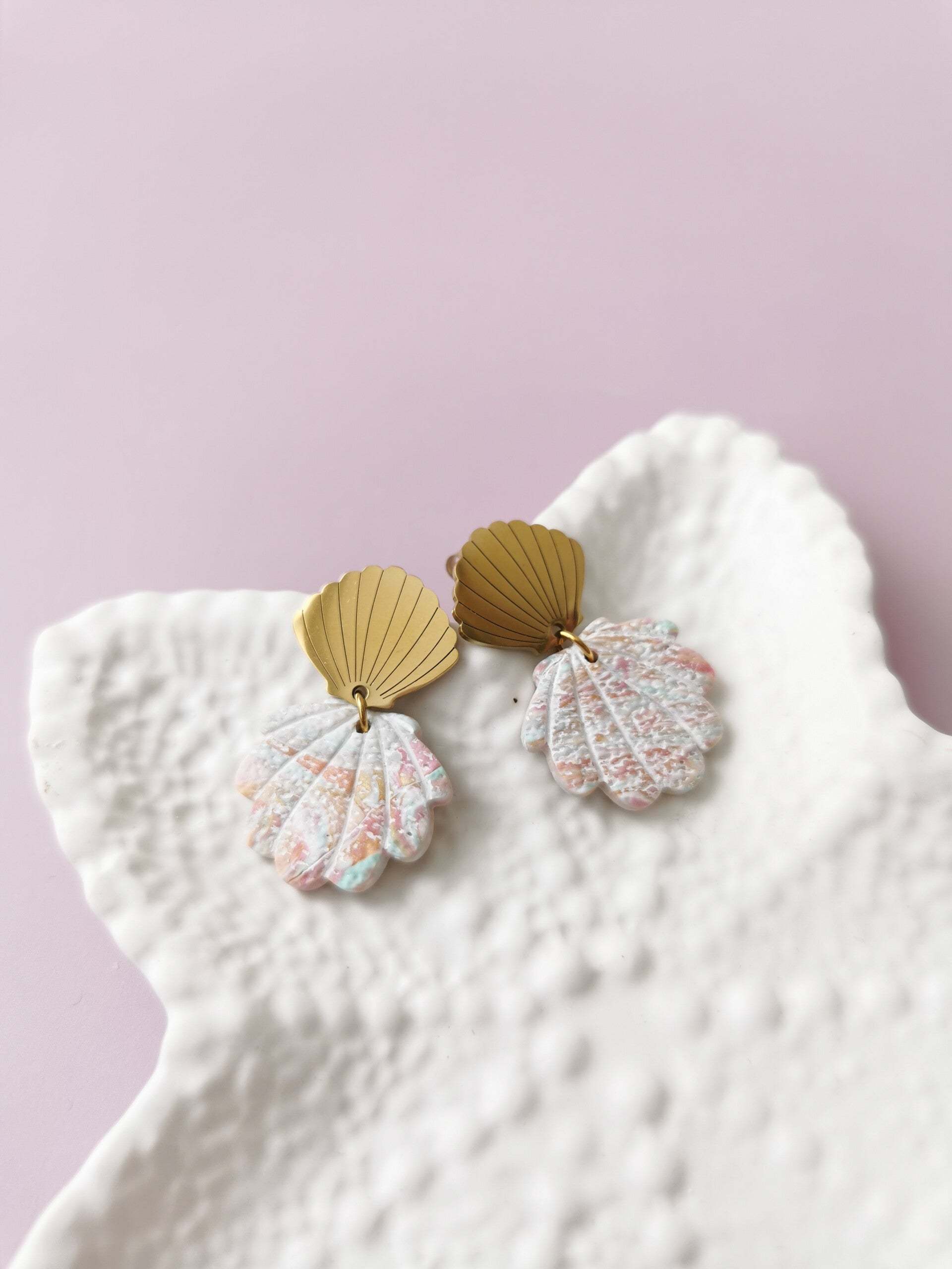 Kleinere schelp oorbellen in gemêleerde kleuren met RVS top. Ze zijn handgemaakt van polymeerklei, licht in gewicht en lekker kleurrijk!