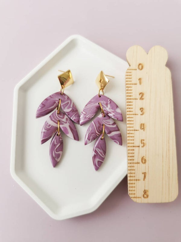 Prachtige blad hangers in gemêleerde paarstinten en met een subtiel glittertje. Ze zijn handgemaakt van polymeerklei, licht in gewicht en een beetje boho! Ze zijn tevens afgewerkt met resin wat zorgt voor een mooie glans.