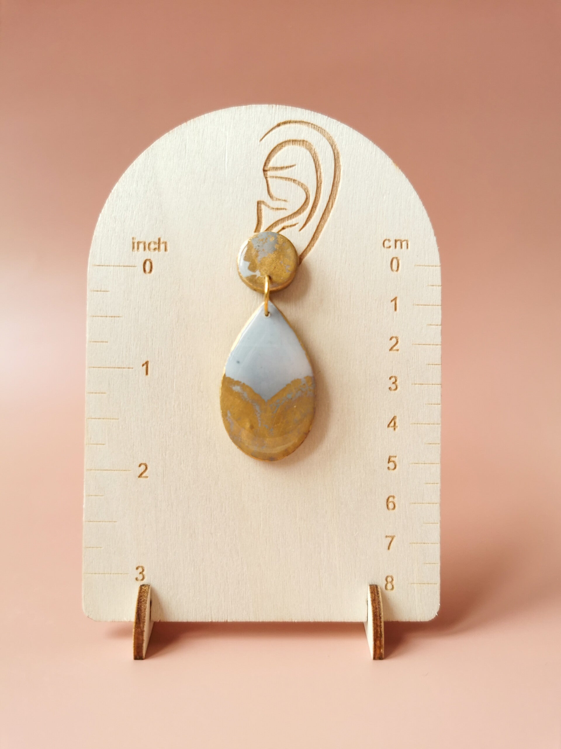 Prachtige unieke zacht blauwe hangers met gouden accenten. De achterkant en zijkanten zijn met goud gilding afgewerkt. Ze zijn handgemaakt van polymeerklei, licht in gewicht en lekker kleurrijk! Ze zijn tevens afgewerkt met resin wat zorgt voor een mooie glans.