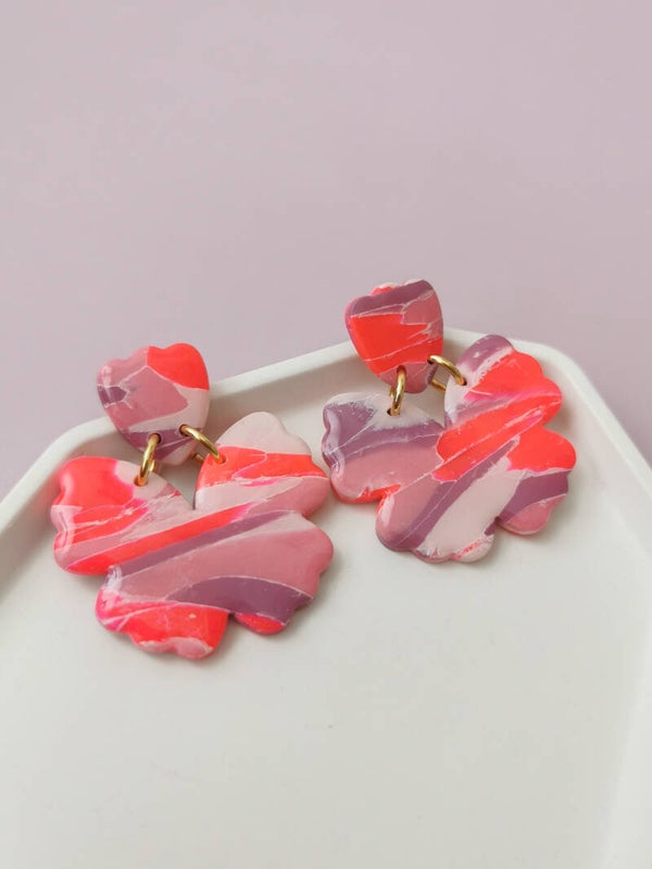 Bloemoorbellen in paarse en (neon) roze kleuren en met gouden ringetjes. Ze zijn handgemaakt van polymeerklei, licht in gewicht en lekker kleurrijk! Ze zijn tevens afgewerkt met resin. Dit zorgt voor een mooie glans.