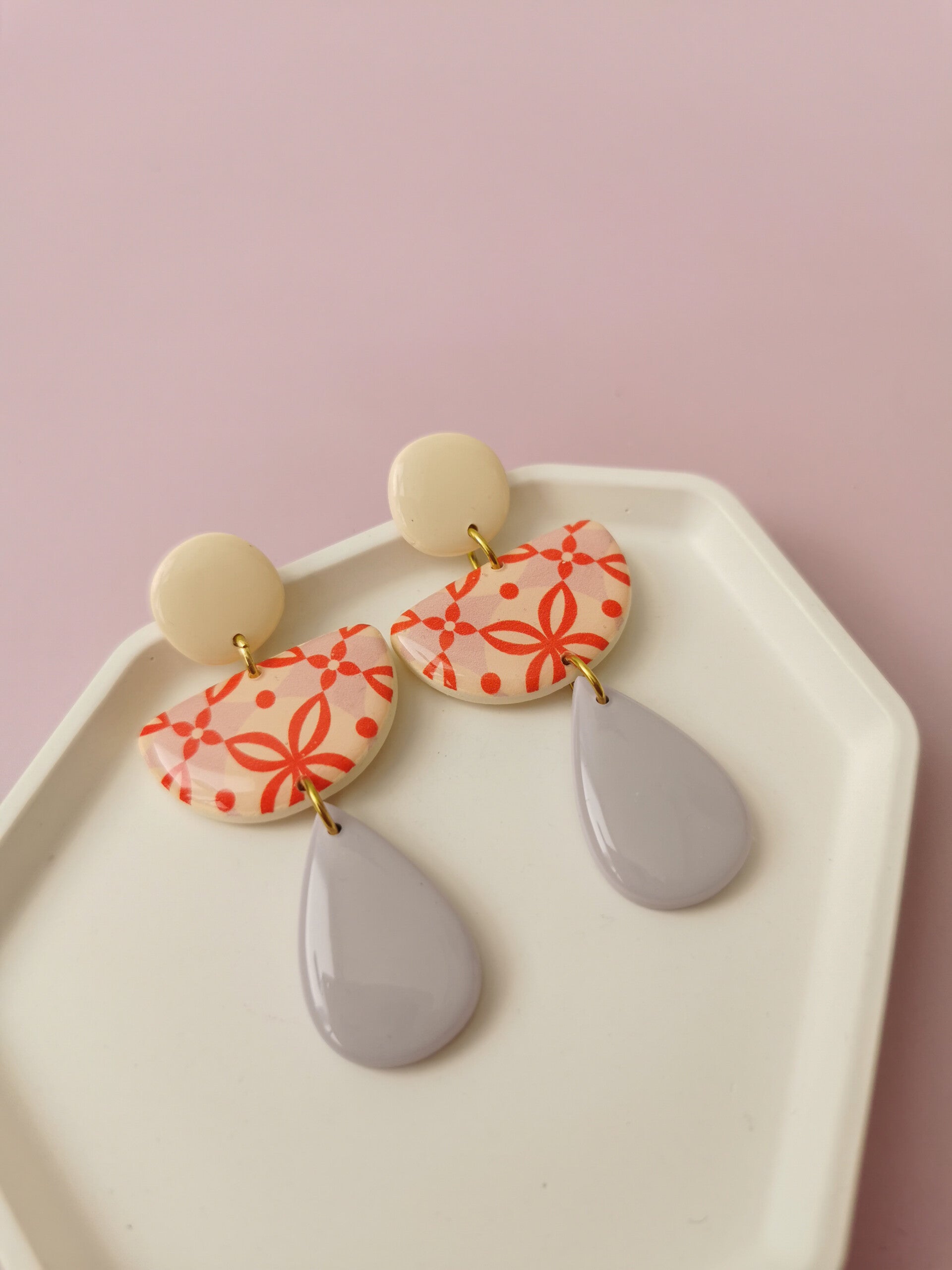 Kleurrijke elegante oorbellen in de kleuren rood, ivoor en lavendel. Ze zijn handgemaakt van polymeerklei, licht in gewicht en lekker kleurrijk! Ze zijn tevens afgewerkt met resin wat zorgt voor een mooie glans.