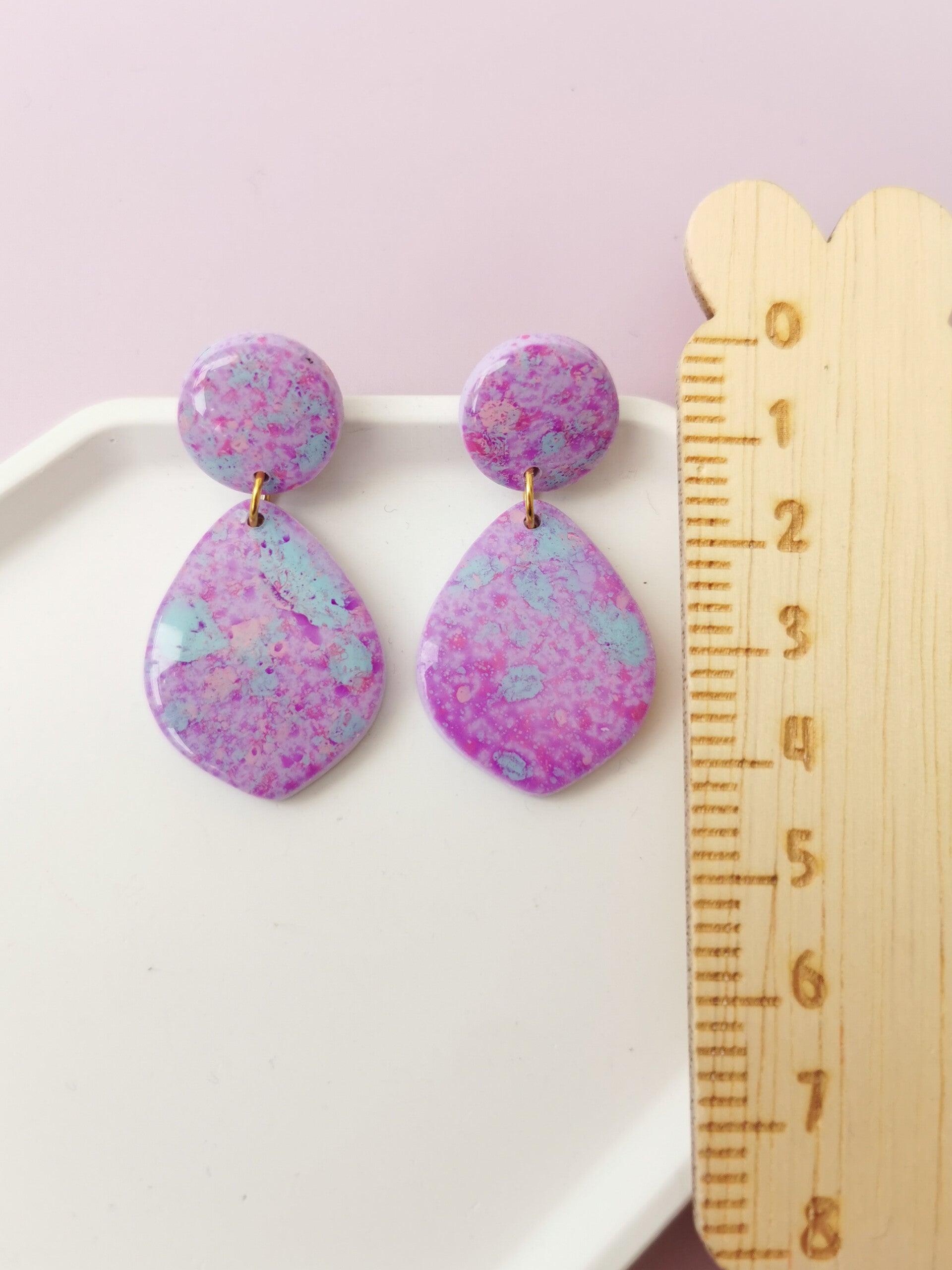 Lila kleurige oorbellen met een gespikkeld motief. Ze zijn handgemaakt van polymeerklei, licht in gewicht en lekker kleurrijk! Ze zijn tevens afgewerkt met resin wat zorgt voor een mooie glans.