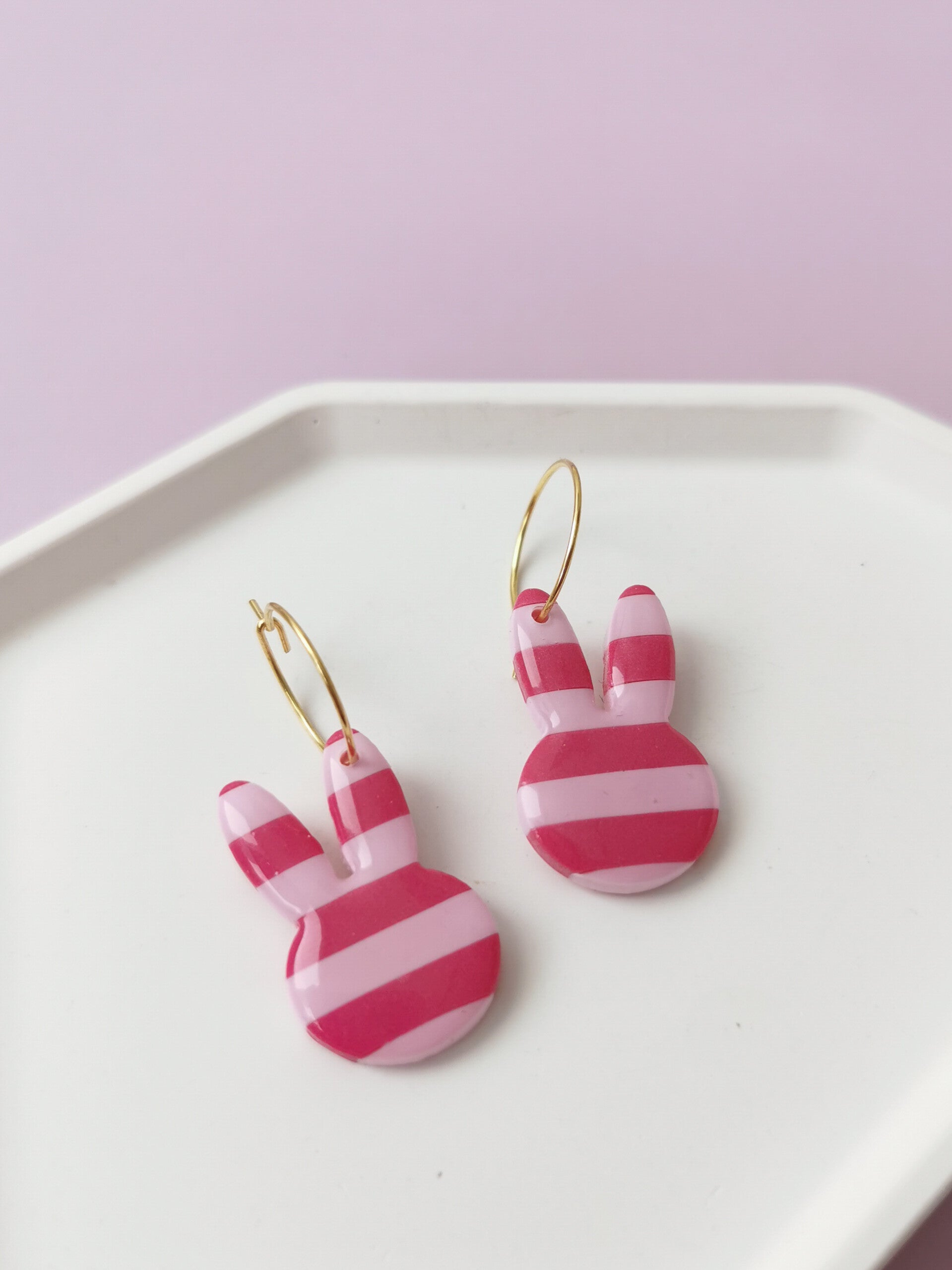 Gestreepte KoNijntje oorbellen. Ze zijn handgemaakt van polymeerklei, licht in gewicht en lekker kleurrijk! Ze zijn tevens afgewerkt met resin wat zorgt voor een mooie glans.