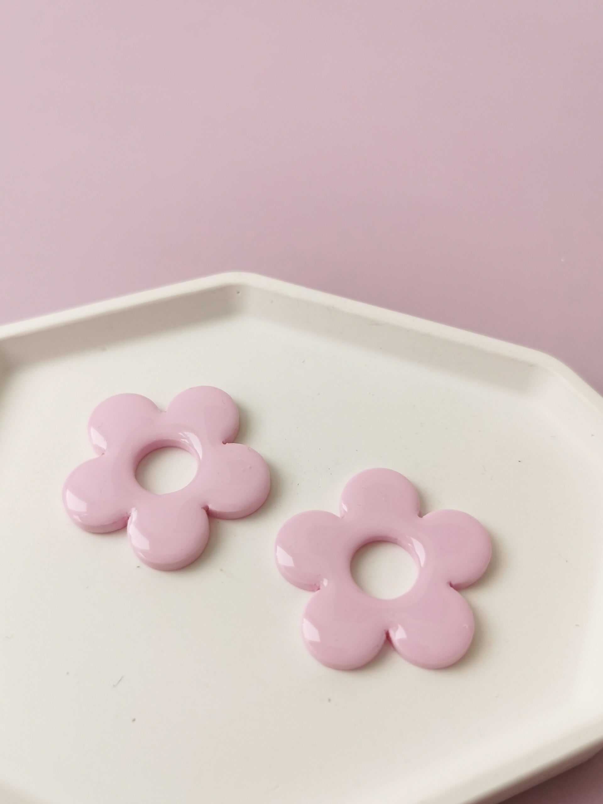 Kleurrijke bloemvormige bedels in lente tinten. Ze zijn gemaakt van polymeerklei en afgewerkt met resin, waardoor ze een mooie glans hebben.