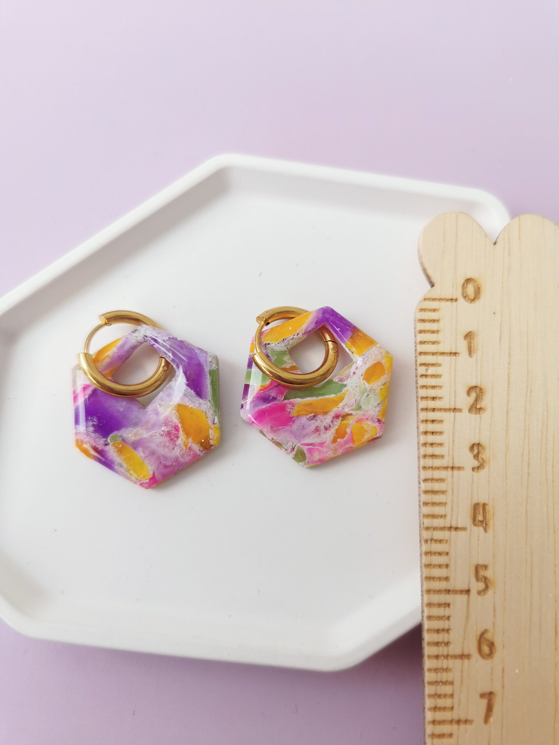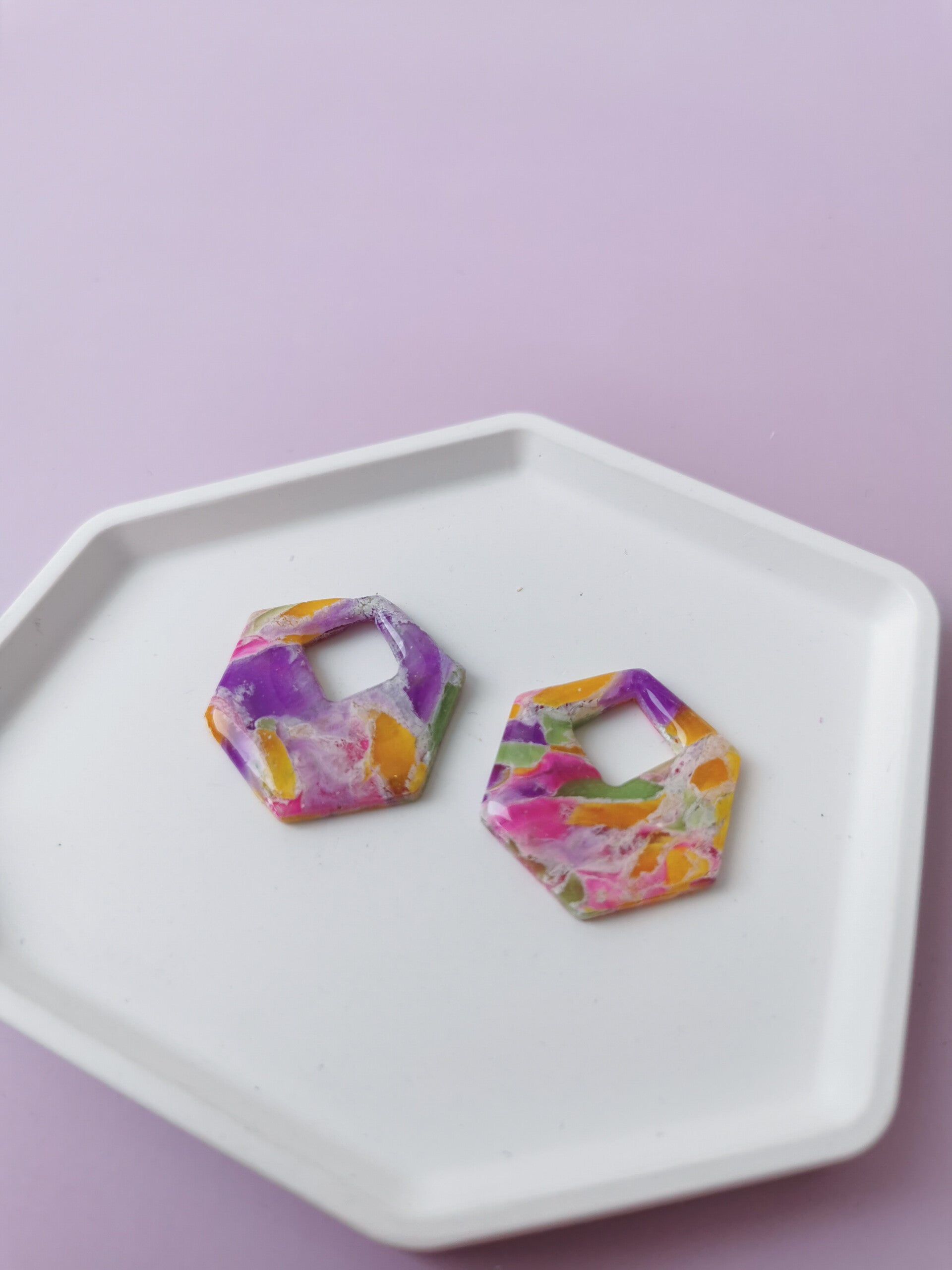 Zeshoekige bedels uit de translucent (doorzichtig) collectie. Ze zijn gemaakt van polymeerklei en super licht in gewicht. Ze zijn tevens afgewerkt met resin wat zorgt voor een mooie glans.