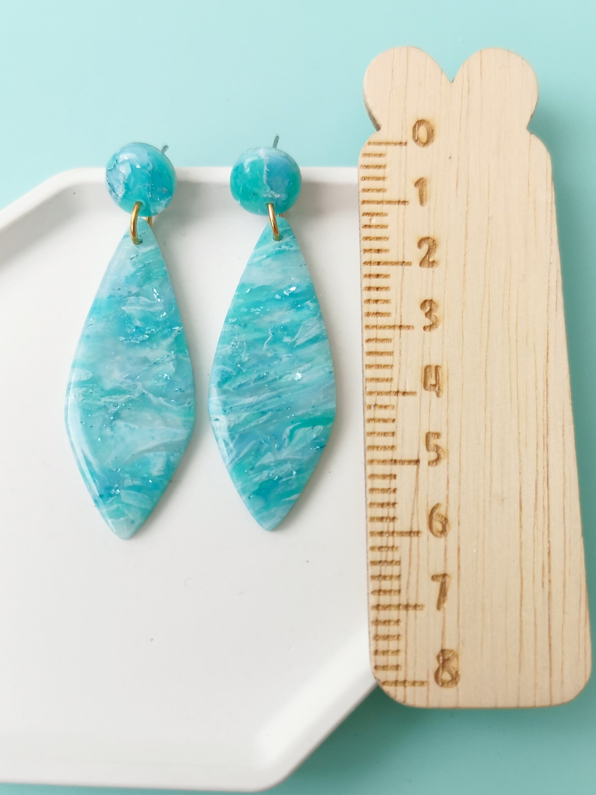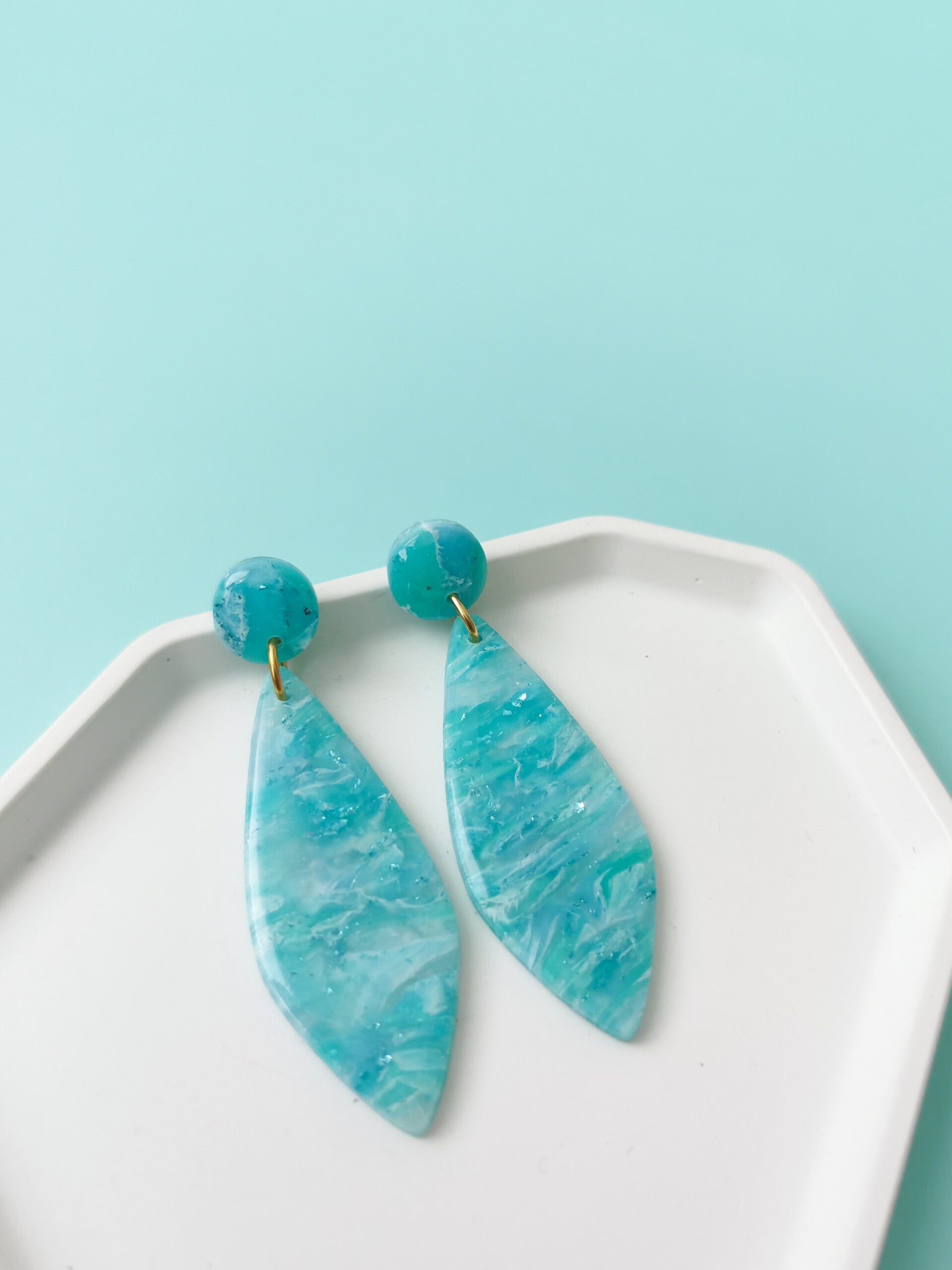 Aquablauwe dagger oorbellen in blauwtinten en met blauw metallic blad. Ze zijn handgemaakt van polymeerklei, licht in gewicht en lekker kleurrijk! Ze zijn tevens afgewerkt met resin wat zorgt voor een mooie glans.