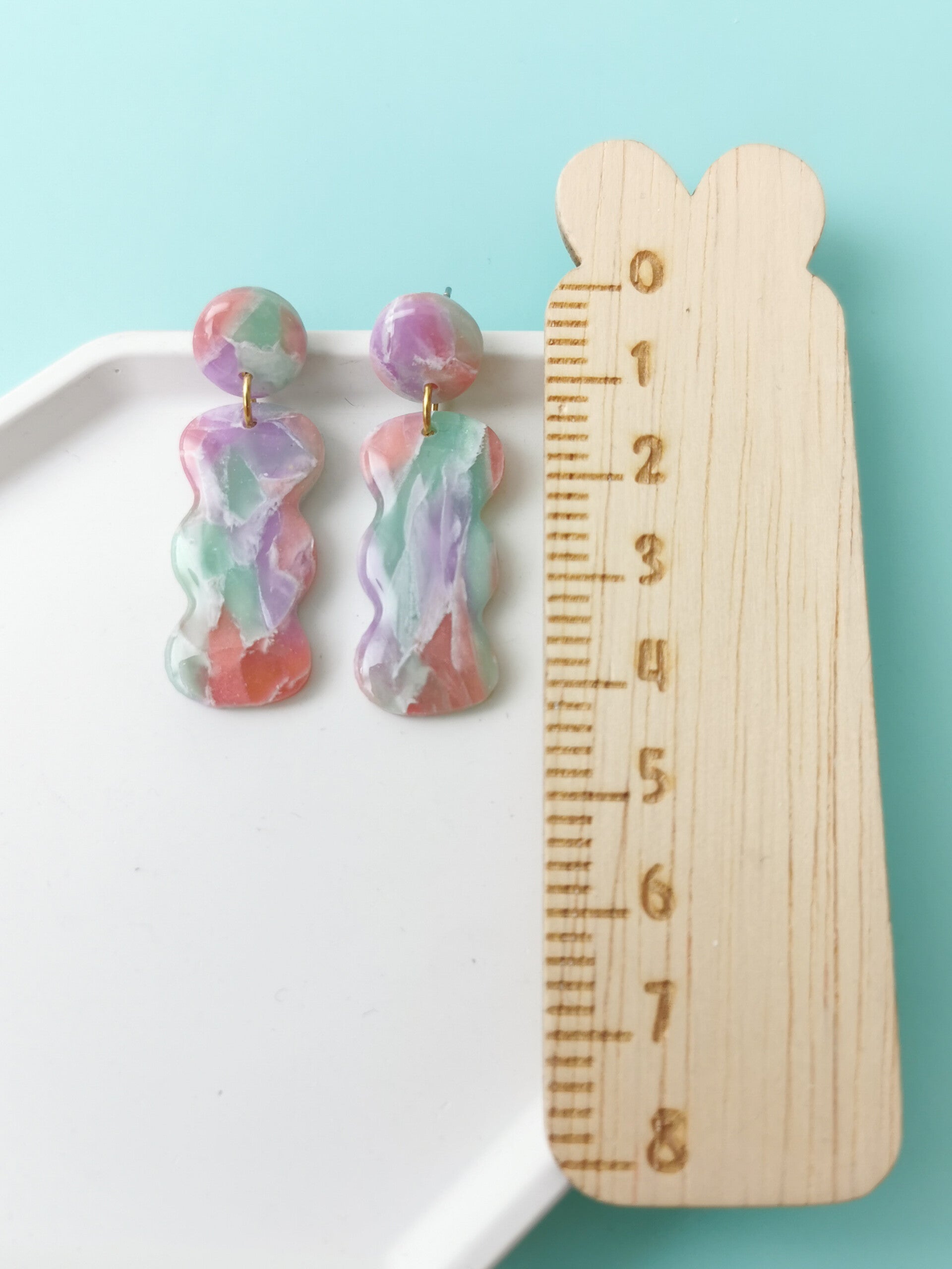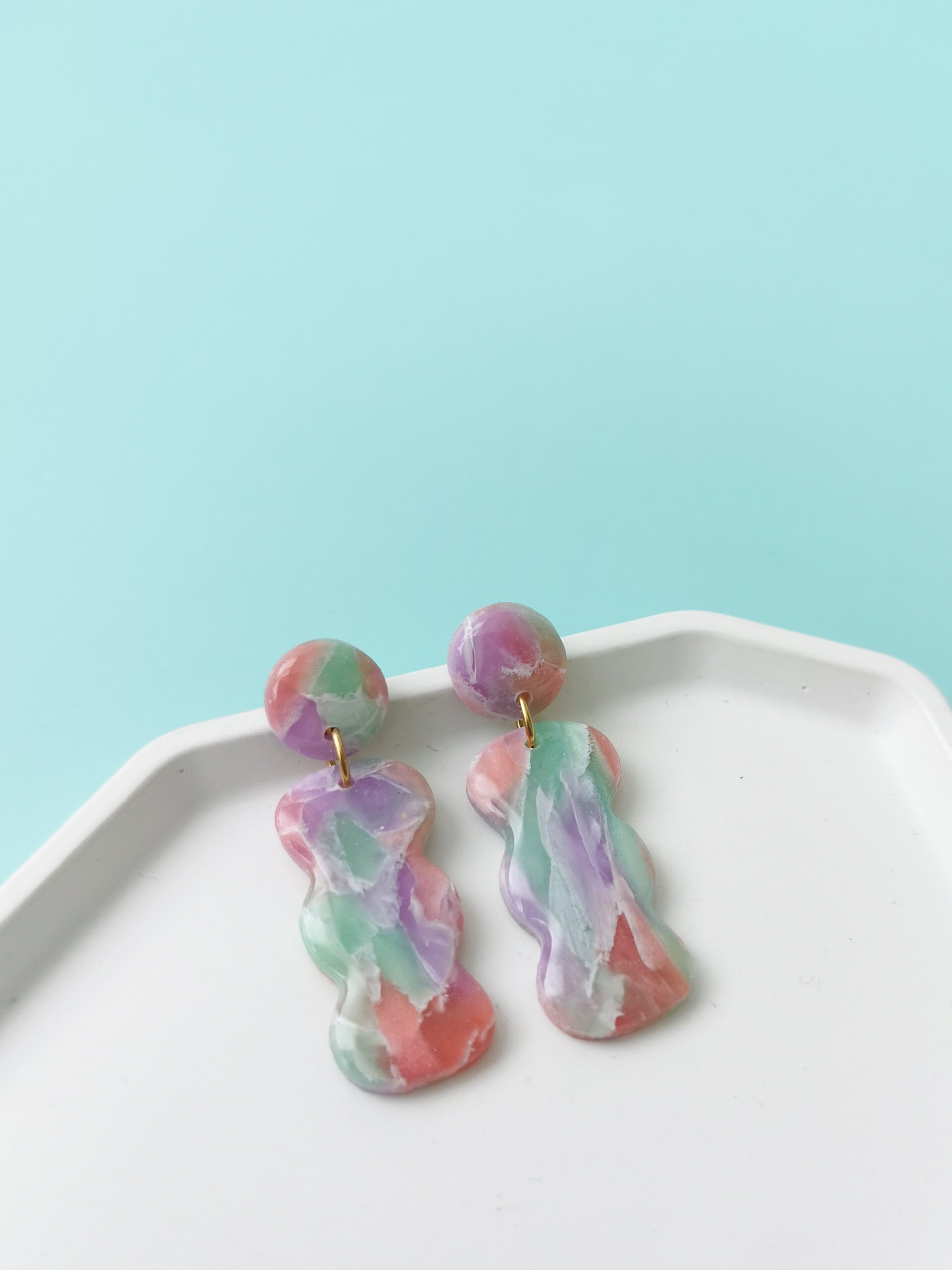 Oorbellen in 3 prachtige zachte kleuren in een golvende vorm. Ze zijn handgemaakt van polymeerklei, licht in gewicht en lekker kleurrijk! Ze zijn tevens afgewerkt met resin wat zorgt voor een mooie glans.