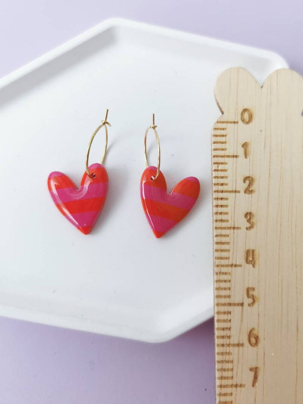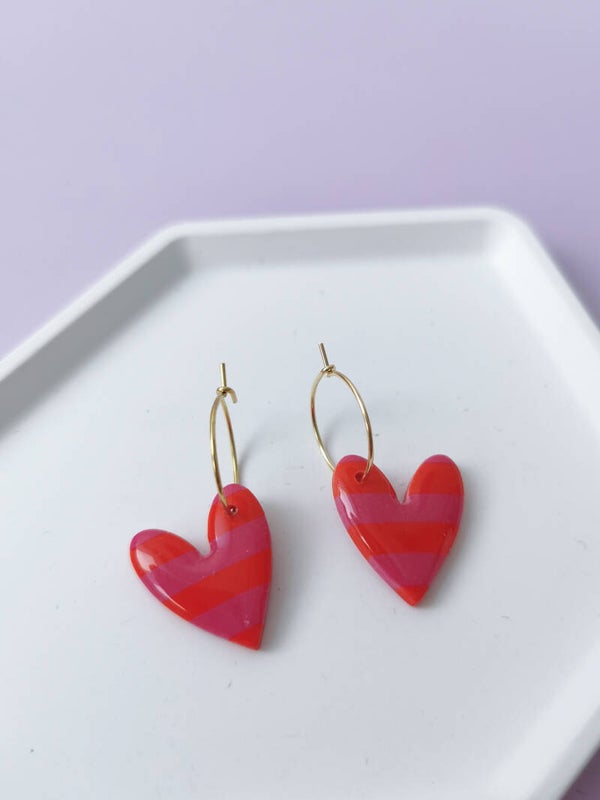 Rode hartjes oorbellen met een gouden glittertje. Ze zijn handgemaakt van polymeerklei, licht in gewicht en lekker kleurrijk! Ze zijn tevens afgewerkt met resin wat zorgt voor een mooie glans.